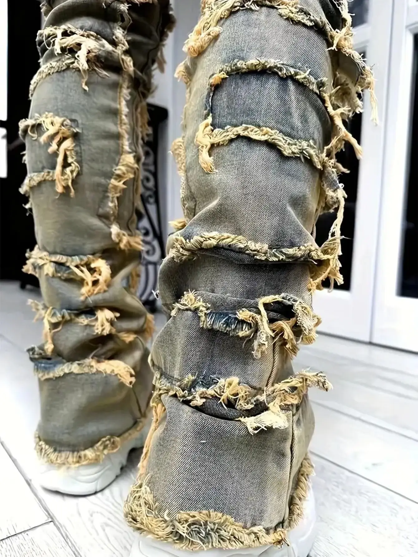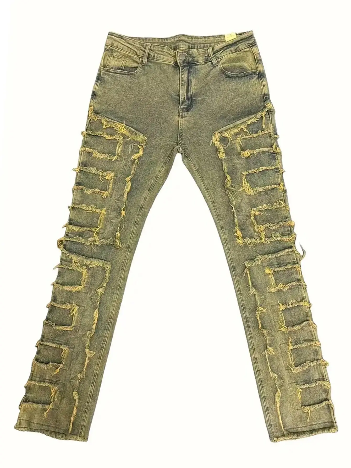 Blugi bărbătești cu multiple lucrări realizate manual, margini zdrențuite, croială slim fit